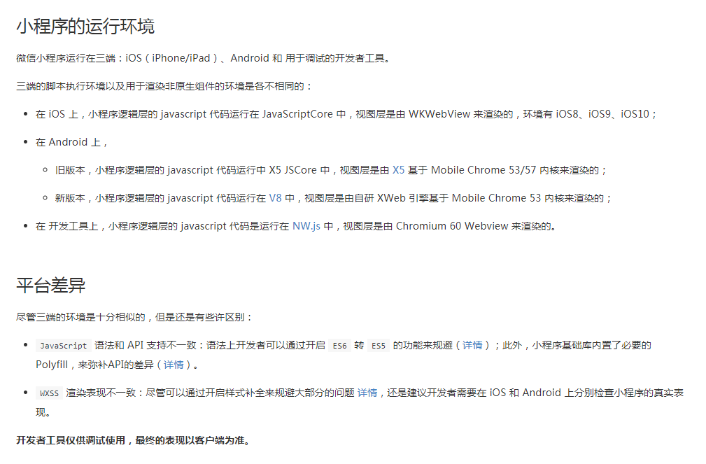 微信小程序的 JavaScript 运行环境即不是 Browser 也不是 Node.js。它运行在微信 App 的上下文中,不能操作DOM,没有window, document, 也不能通过 Node.js 相关接口访问操作系统 API