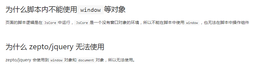 微信小程序的 JavaScript 运行环境即不是 Browser 也不是 Node.js。它运行在微信 App 的上下文中,不能操作DOM,没有window, document, 也不能通过 Node.js 相关接口访问操作系统 API